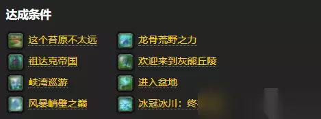 4、完成【这个苔原不太远】、【祖达克帝国】、【峡湾巡游】、【风暴峭壁之巅】、【龙骨荒野之力】、【欢迎来到灰能丘陵】、【进入盆地】、【冰冠冰川:终极目标】成就。