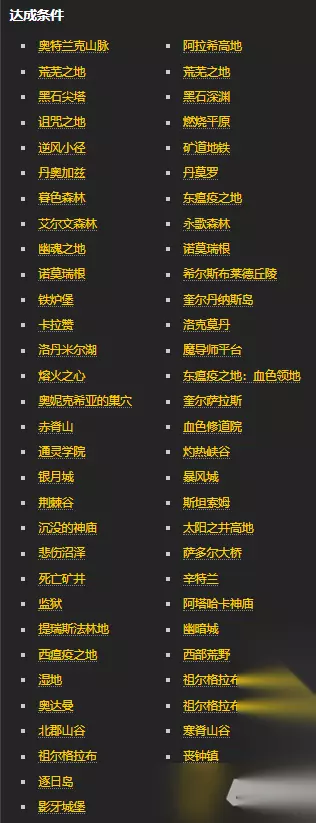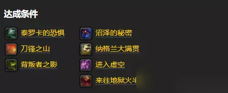 3、完成【泰罗卡的恐惧】、【刀锋之山】、【背叛者之影】、【沼泽的秘密】、【纳格兰大满贯】、【进入虚空】、【来往地狱火半岛】成就。