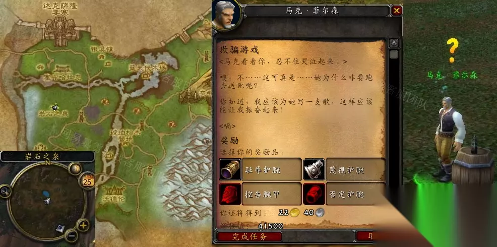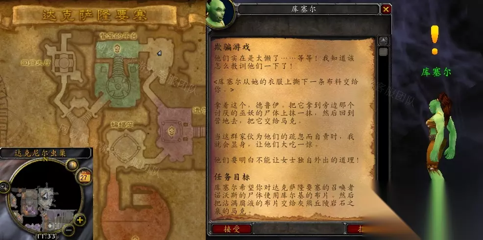 《魔兽世界》怀旧服wlk欺骗游戏任务攻略 接取等级:72 接取NPC:库塞尔(达克萨隆要塞) 完成NPC:马克·菲尔森(灰熊丘陵,岩石之泉) 奖励声望:无 任务开始: