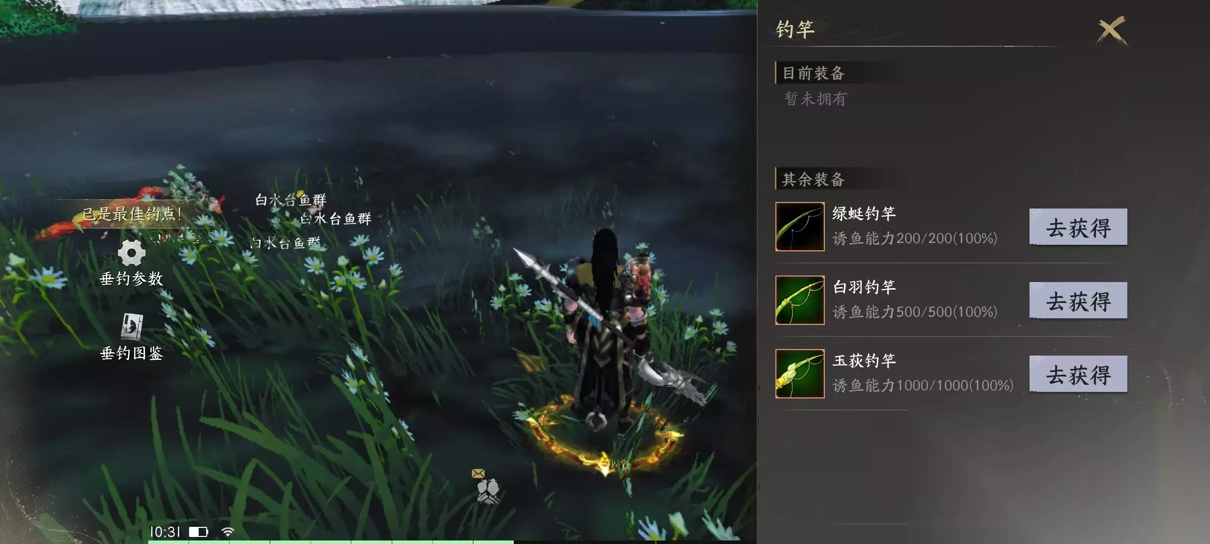 要想钓鱼,需要人物等级先达到20级以上,然后找到渔歌子或者是寒江雪购买鱼竿、钓饵,接下来就可以在水边钓鱼了。游戏中有了很多钓鱼区域,分为低级、中级和高级这三个类型。其中低级区域对钓鱼声望没有要求,任何玩家都可以去钓,中级区域需要声望达到1000点才可以去,高级区域则需要声望达到10000点。所以最初阶段只能是从低级区域开始不断刷声望,然后才能往上提升区域,高级区域获得的奖励自然更加丰厚。