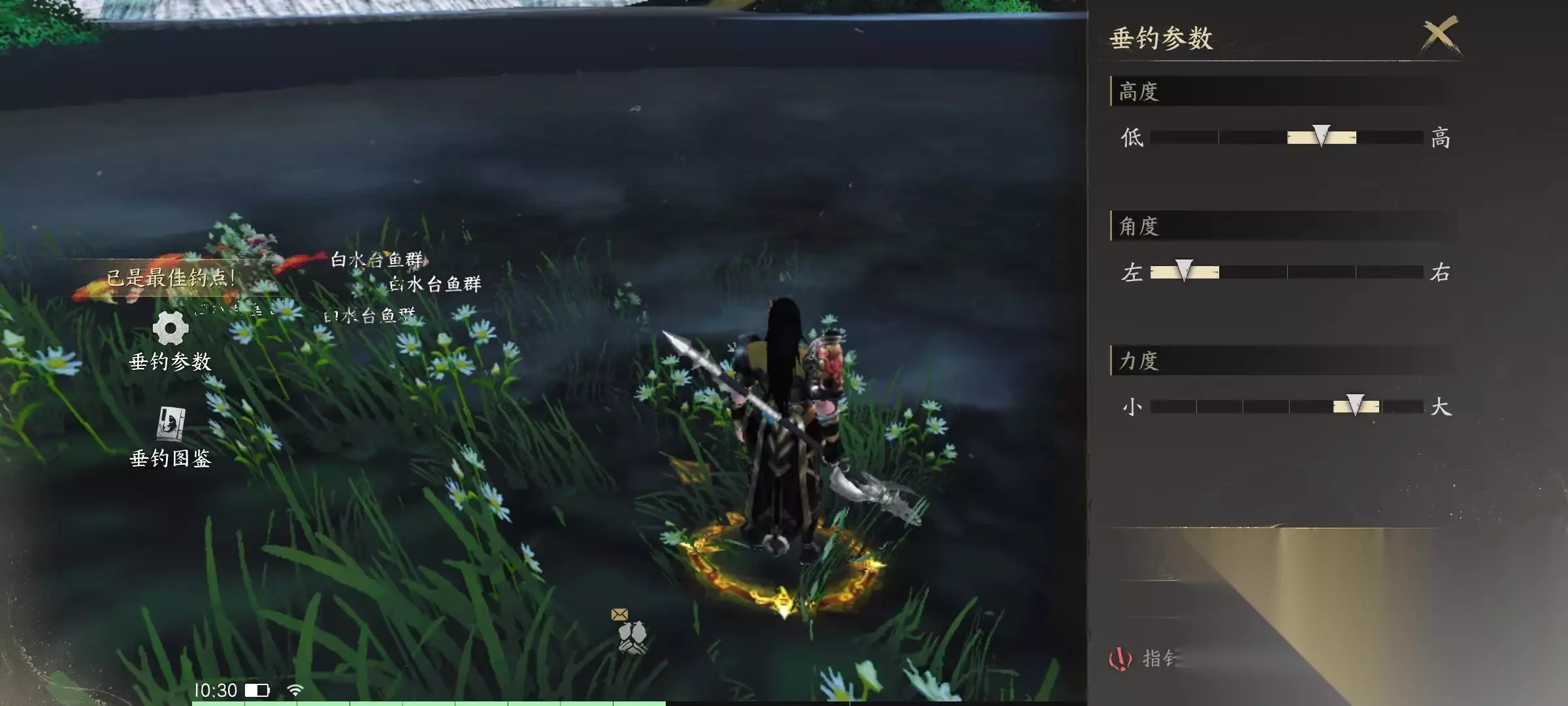 至于操作其实非常简单,在界面的左下角打开功能,找到垂钓,点击之后就可以自动前往附近最高等级的钓鱼区。如果角色可以在此水域垂钓,那么就直接使用垂钓指令,就会进入到垂钓的界面中。这里需要提前设置一些参数,包括调节垂钓的高度、力度和角度。当指针处于金色区域时,上钩的几率是最大的。钓鱼过程中,每隔一段时间系统就会进行相应的提示出现在界面中间,当提示水面溅起水花时,就可以直接点击右下角的按钮进行收鱼了。成功钓鱼后可以获得经验、声望、鱼类和道具,但如果没有成功使鱼溜走了,那么也不是一无所获。可以获得相应的经验。