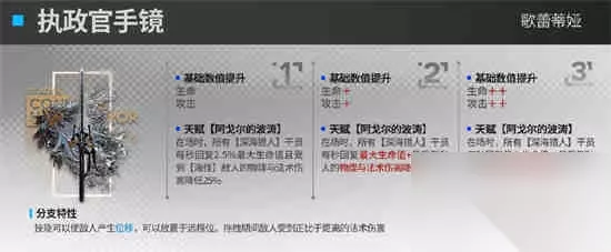 分支特性 技能可以使敌人产生位移,可以放置于远程位。拖拽期间敌人受到正比于距离的法术伤害 一级模组效果 基础数值提升 生命 攻击 天赋【阿戈尔的波涛】 在场时,所有【深海猎人】干员每秒回复2.5%最大生命值且受到【海怪】敌人的物理与法术伤害降低25% 二级模组效果 基础数值提升 生命+ 攻击+ 天赋【阿戈尔的波涛】 在场时,所有【深海猎人】干员每秒回复最大生命值+且受到敌人的物理与法术伤害降低+ 三级模组效果 基础数值提升 生命++ 攻击++ 天赋【阿戈尔的波涛】 在场时,所有【深海猎人】干员每秒回复最大生命值++且受到敌人的物理与法术伤害降低++ 评价:歌蕾蒂娅的模组最优秀的一点在于二级模组的物理与法术伤害降低提升,建议开模组一定要升到至少2级,这条双减非常关键,提升了她的实用性,另外结合模组的分值特性,也提升了歌蕾蒂娅的输出能力,适配还是不错的。