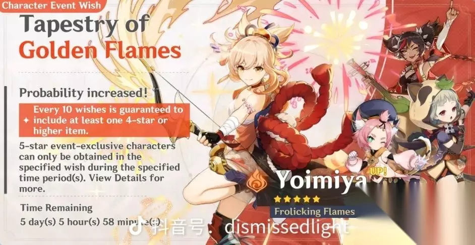 先开“雷神+九条裟罗”角色池,其中九条裟罗为四星弓箭手角色,雷神为五星长柄角色