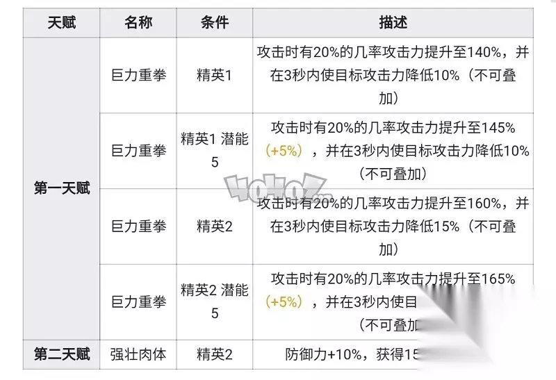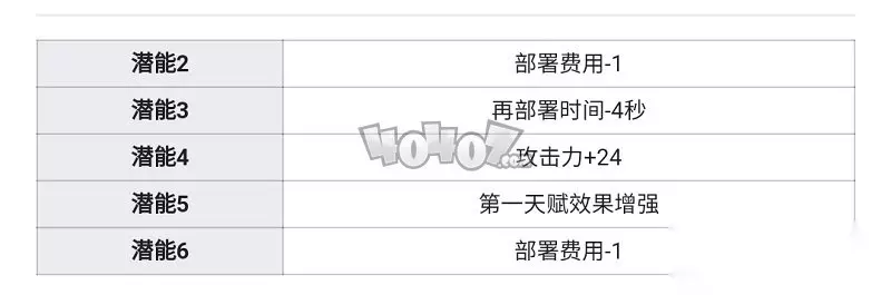 山的天赋一没有辜负在前瞻文章中的期望,在精二后最高20%概率将攻击力提升到160%的效果已经算是不错的表现了,虽然20%的概率依旧不算很高,但在开启三技能后依靠三技能的加成山的天赋一会变得效果极为强劲。此外天赋一还能够对敌人造成3秒内15%的攻击力降低,有效提升了山的生存能力。 而山的天赋二则进一步的提升了山的生存能力,天赋二会永久为山提供10%的防御加成和15%的物理闪避,这两项加成有效的提升了山在场上的生存和站场能力。 潜能