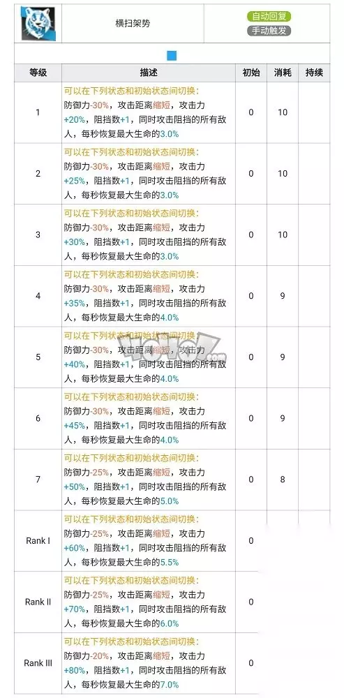 一技能是一个攻击回复自动触发技能,在七级时基本等于没四次攻击后下次攻击会是一次200%伤害的攻击,并且攻击两个目标。整体来看属于一个较为标准的增伤技能,不过比起常规的通用技能山一技能的加成更高,表现更好。此外一技能在专三后消耗会降低到3点,但是攻击力加成提升不高,并没有太大的专三必要。 专精建议:七级够用 横扫架势(二技能)