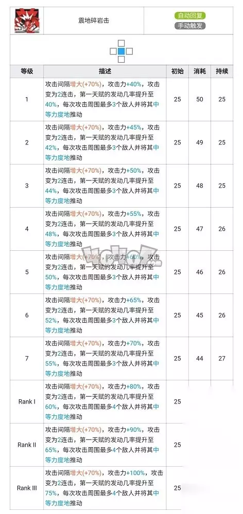 需要落地短暂启动的开关技能,在开启后会以降低防御力为提升攻击力,缩短攻击距离,增加阻挡数并每秒回复生命。乍一看二技能由于有自回复因此相当适合单打一路,但是由于开启后会带来最低20%(最高30%)的防御力降低的原因,该技能的自回复完全无法弥补防御力降低导致的受伤加重。携带二技能的山适合在盾侧或盾前进行辅助输出,从而在最大程度发挥技能效果的同时避免因为防御降低导致的暴毙。 专精建议:有条件专三 震地碎岩击(三技能)