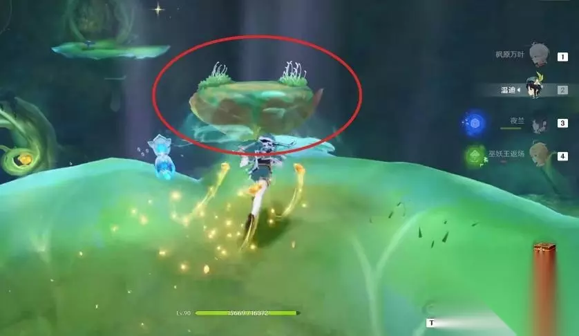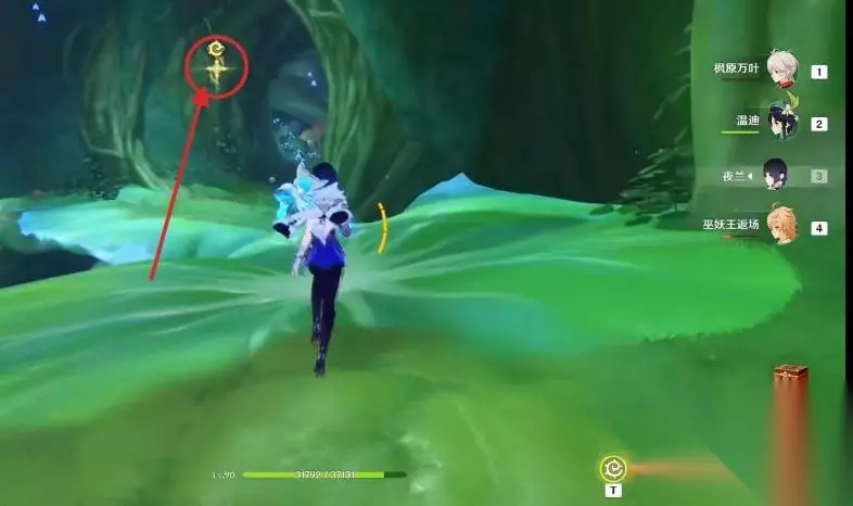 8、然后就可以拾取到第三个道具了。出来后,右手边有一个弹力蘑菇,我们用弹力蘑菇跳到一开始的平台上,用【四叶印】飞到中间的小平台上。沿着桥走到机关处,点击启动。