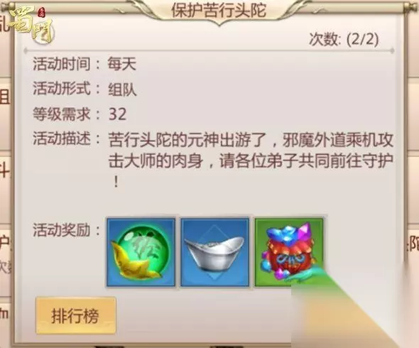 组队任务: 保护苦行头陀: 小编推荐完成技巧:保护苦行头陀这个任务,保护波数越高奖励越多,当苦行头陀血量为0或全体队员死亡即为任务失败,尽可能的抵挡更多波数的怪物吧!