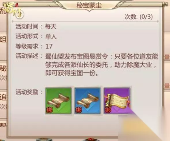 在《蜀门手游》中,完成每天的天书任务可以得到大量奖励,下面小编就来介绍下目前版本天书系统中的日常活动吧~ 单人任务: 秘宝蒙尘: 小编推荐完成技巧:根据任务提示来完成,会得到级别不同的藏宝图,使用藏宝图可以获得锻造宝石。