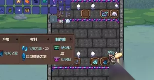羽毛可以通过击杀高空区域的鹰身女妖获得,而光明之魂则要在地下神圣之地刷怪。恶魔之翼的配方类似,只是把光明之魂换成了暗影之魂。仙灵之翼需要20个飞翔之魂加上100个妖精尘,妖精尘可以在神圣地击败妖精获得。鸟妖之翼需要20个飞翔之魂和1个巨型鸟妖之羽,后者有0.5%的概率从鸟妖掉落。
