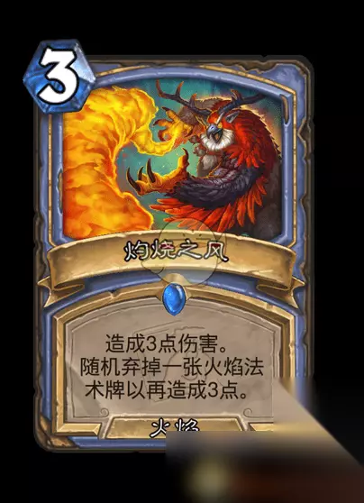 二、灼烧之风 类型: 法术 稀有度: 稀有 卡牌系列: 标准卡牌 职业: 法师 制作消耗: 100/800(金卡) 分解价值: 20/100(金卡) 画师: AJ Nazzaro 效果:造成3点伤害。随机弃掉一张火焰法术牌以再造成3点。