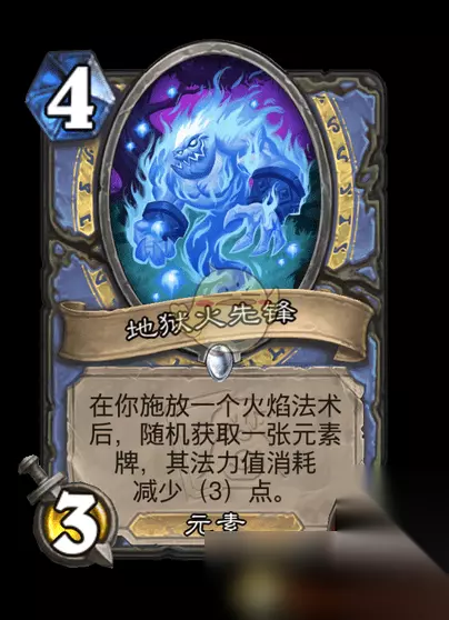 三、地狱火先锋 类型: 随从 随从类型: 元素 稀有度: 普通 卡牌系列: 标准卡牌 职业: 法师 制作消耗: 40/400(金卡) 分解价值: 5/50(金卡) 画师: Edward Frayna 效果:在你施放一个火焰法术后,随机获取一张元素牌,其法力值消耗减少(3)点。