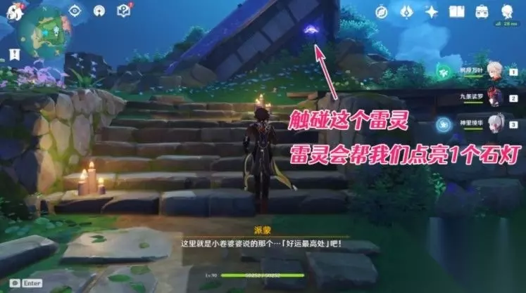 四下环顾这所谓的「好运最高处」,似乎也只有周围这一圈石灯有些突兀,不如我们尝试把这些石灯点亮看看吧。不过附近并没有雷樱枝条,因此我们需要用雷灵来解锁石灯。 首先是雷灵1: