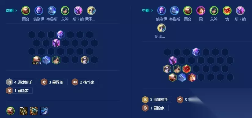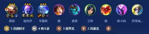 前期开3迅捷射手搭配3星界龙过渡,因为星界龙羁绊效果,俄洛依和斯卡纳比较容易2星,能顶得住前排。3-2升6图奇三星后再拉等级,补齐阵容。如果上不去9,可以龙神之路选择收100层的冠冕奖励把阵容补齐。如果韦鲁斯没办法三星,则用2星霞去做副C 搜牌节奏 6级大D图奇三星,7级8级根据牌浪D牌,保证主坦俄洛依的三星。