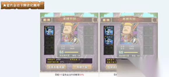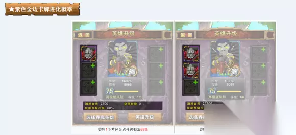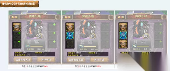 2.普通的小怪绿色卡不能进化金龙,只有BOSS卡进化后才能进行技能升级。单张绿金卡牌的技能升级概率是34%;两张68%;三张100%单张蓝金卡牌的技能升级概率是51%;两张100%单张紫金卡牌的技能升级概率是68%;两张100%一蓝一紫的升级概率是100%。
