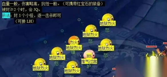 4、五行山(100.26)找【燧火石】点击触发战斗; 杀法: ①血量一般伤害略高但抗性一般,携带红宝石的装备 ②先封1个小怪然后在逐一击杀(可接 LH),封≥2时,会JQ