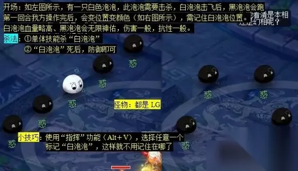 3、五行山(40.24)找【素水石】点击触发战斗; 杀法: ①开场后先用单体技能杀“白泡泡”,白泡泡击飞后,黑泡泡会跑 ②第一回合结束后会变位置变颜色需记住白泡泡位置 ③【白泡泡】死后,防御即可,可以直接用指挥功能标记白泡泡