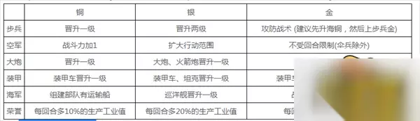 勋章获得方法 通过战役获得勋章,战役之后会有星级评定,五星最高,可以获得50勋章,以此类推。 新手常见的勋章问题: 1.为什么铜质勋章后面还是铜质勋章?每级勋章都要升两次? 答:刚开始你没有勋章效果,你看到的只是升到铜的效果,所以当你升到铜之后文字描述没有变化。 2.海军铜质勋章前后两次有什么区别? 答:海军铜是部队自带运输船,银是巡洋舰驱逐舰升一级,金是战列舰航母升一级。 3.装甲勋章不升级坦克吗? 答:装甲铜是装甲车升一级,银是普通坦克升一级,金是重坦克升一级。 4.步兵金到底强吗?有人说步兵被兵种相克。 答:步兵金非常强。无论在战役还是征服都很好用。虽然兵种上来说是被克,但是金章的巨大加成和步兵本身的低成本足够抹平这个劣势。这游戏完全可以用人海战术秒杀一切。 5.空军有必要升吗? 答:空军只有银章有点用,而且用处也很有限,建议放到后面升。 6.哪个勋章升到顶最管用? 答:步兵,荣誉
