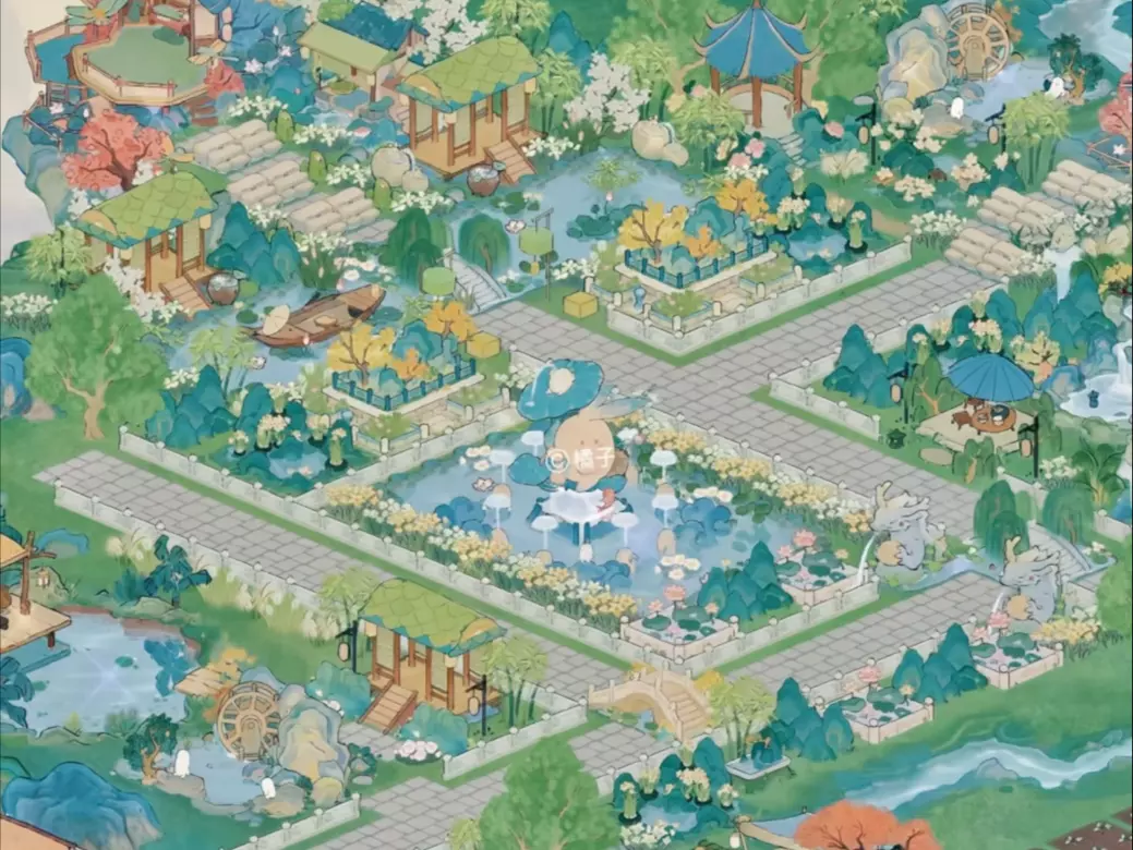 这是《桃源深处有人家》的秋景御花园布局展示,园内中式亭台楼阁临水而建,搭配红黄秋树、繁花与水榭画舫,日夜景致皆如画,尽显古风园林的秋日雅致。