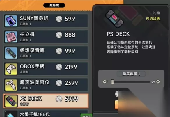心仪礼物: 1、PSDECK 巨硬公司最新发布的串流掌机搭载了北斗定位系统,让游戏延迟降低到了毫秒级别。 购买地点:购物商场一楼左侧数码产品店 价格:5999