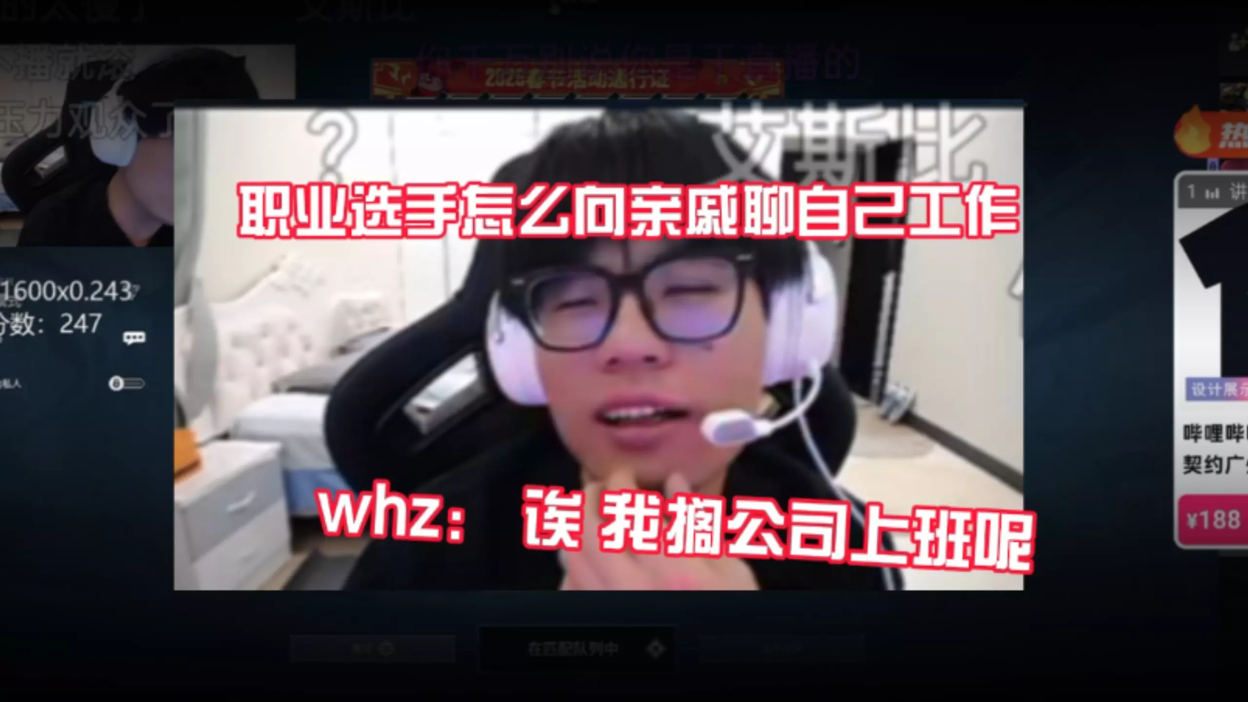 职业选手都怎么向家里聊自己工作的 whz:对! 我搁公司上班呢 ! 你们弹幕什么时候能让我光明正大的跟家里说我干直播的