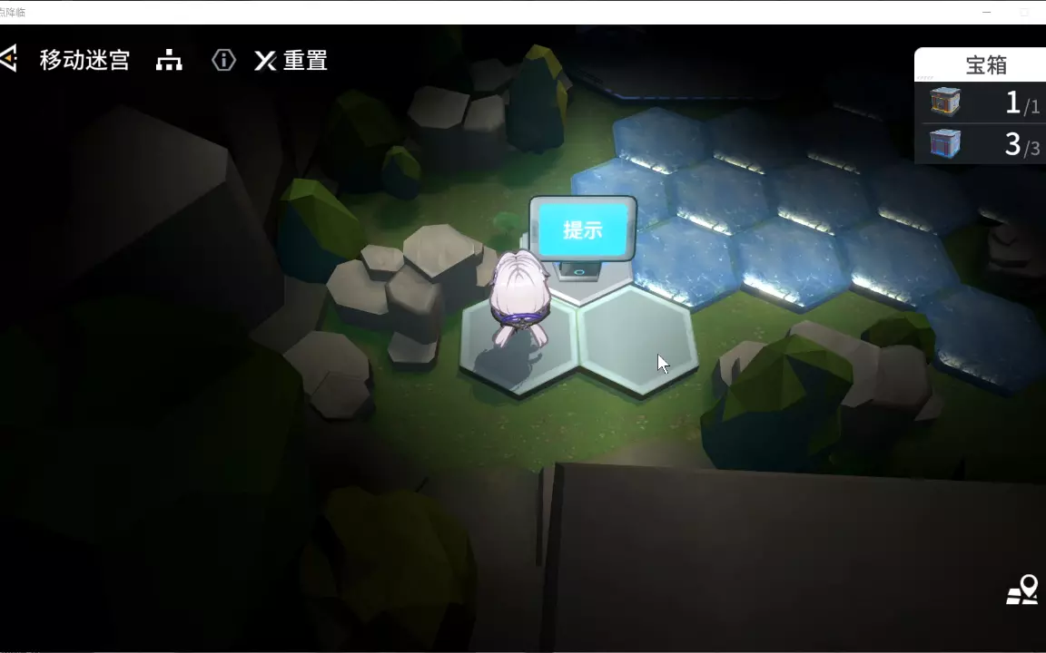 这是游戏《锚点降临》里的不夜幕城移动迷宫玩法展示,画面呈现了角色在六边形格子迷宫中,通过传送装置移动,收集宝箱、完成迷宫挑战的过程。