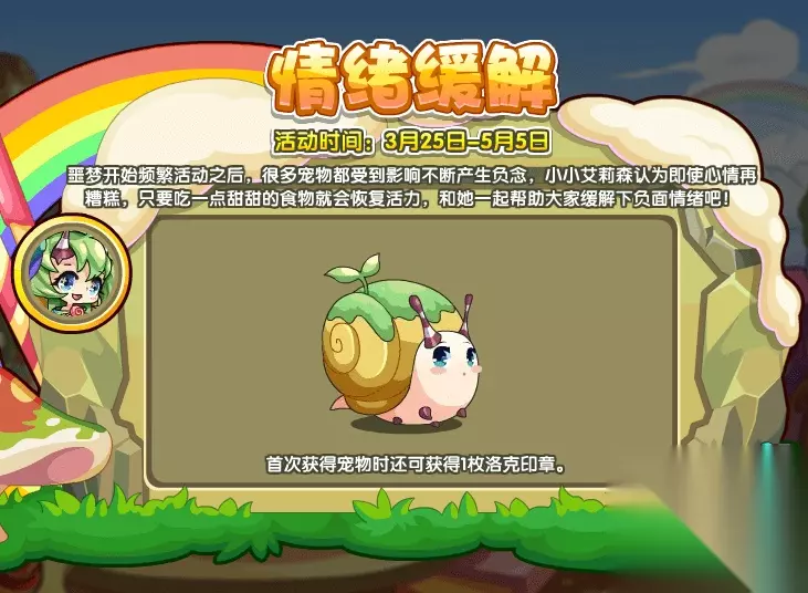 情绪缓解 噩梦开始频繁活动之后,很多宠物都受到影响不断产生负念,小小艾莉森认为即使心情再糟糕,只要吃一点甜甜的食物就会恢复活力,和她一起帮助大家缓解下负面情绪吧! 活动时间:3月25日-5月5日 活动地图:艾美特山岭 活动获得:小小艾莉森,洛克印章