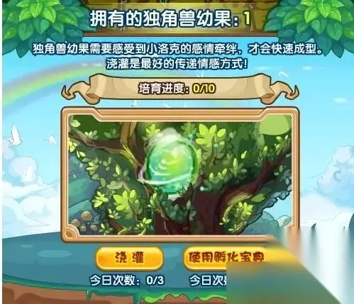 增加独角幼果的培育进度有两种方式: ●方式1:浇灌。点击浇灌即可直接增加1点进度,每天有3次机会。 ●方式2:使用孵化宝典。该操作需要消耗孵化宝典道具,每次使用增加1点进度,每天有3次机会。 玩家每天最多可获得6点培育进度,最快两天就可以培育出一只小独角兽哦!