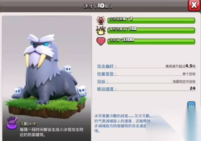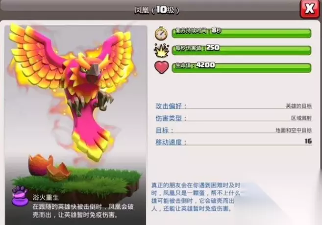 在高本阶段的话,霜牙是蛮王的战宠。它的远程攻击能让防御建筑陷入短暂冰冻状态,还能生成两个小冰怪延缓周边防御的输出节奏。再配合炸弹人协助破墙,霜牙与蛮王的组合性价比远超传统的大牦搭配。尤其适合应对那些防御建筑密集的阵型,能有效降低蛮王推进时受到的集火伤害,让蛮王在复杂环境中保持持续输出。当蛮王承担清边任务时,凤凰会是非常靠谱的选择。它的复活机制能在蛮王遭遇突发高伤害时及时救场,避免因蛮王提前倒下导致清边不彻底,给后续主力部队的推进埋下隐患。8秒的金身效果还能让蛮王在危险区域完成关键建筑的摧毁,大大提升进攻的容错率。尤其适合天女流战术中负责侧翼清边的蛮王,确保主力部队的推进路线不受干扰。如果要保证续航,那么独角则是必选,能在蛮王攻坚时持续回血。