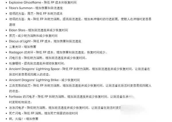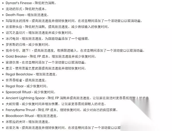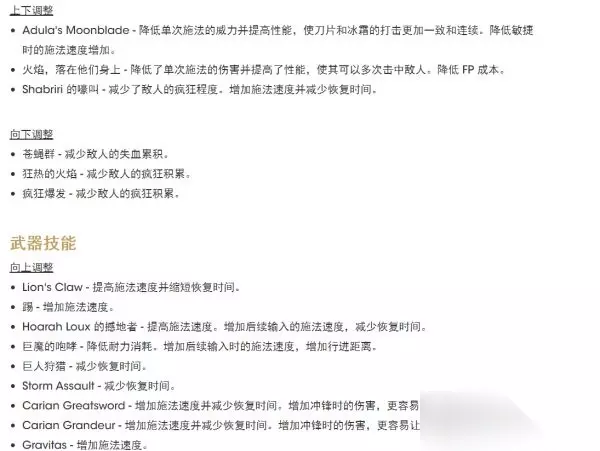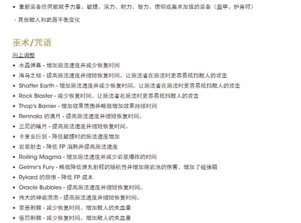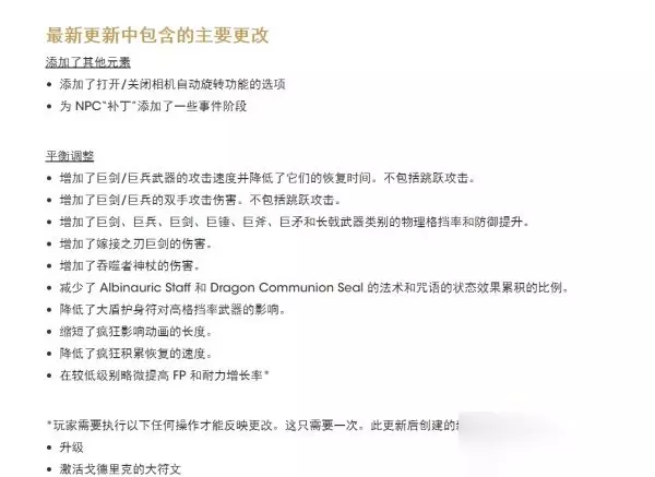 1.04更新内容介绍 1、游戏内容与功能更新 添加了打开/关闭相机自动旋转功能的选项 追加NPC“帕奇”的相关剧情 2、平衡调整 巨剑类武器、巨型武器增加攻击速度和双手状态伤害,减少硬直,提升防御能力(不含跳跃攻击)。 大量魔法和战灰的伤害、消耗调整。 蝇群、癫火、划空癫火积累量表减少。 3、追加多项功能、修正其他错误 例如:为圣树血池前的米莉森添加了防护屏障,防止被玩家杀死。 修正卡利亚式奉伤害,修复在联机时,攻击特效无法被其他玩家看到的问题。 详细图示: