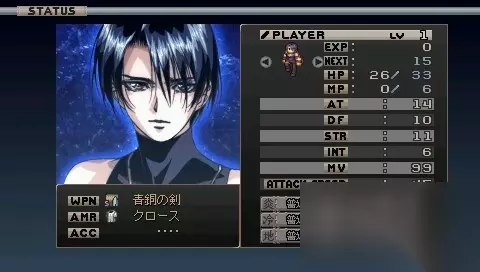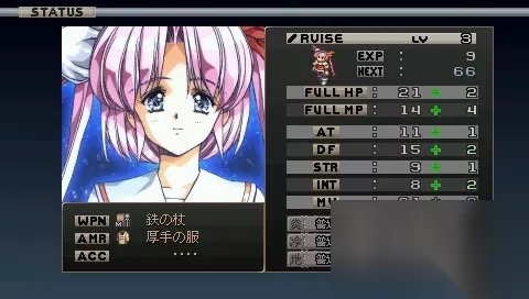 状态栏中左边的WPM表示当前装备武器,AMR表示防具,ACC表示饰品。右边的数据表示能力,包括: AT=攻击力 DF=防御力 STR=体力 INT=智力 MV=移动力 ATTACK SPEED=攻击速度 其中,STR影响角色的最大HP以及战斗中中异常状态的可能性大小;INT则影响角色的最大MP和魔法攻击力大小;MV表示角色移动速度;ATTACK SPEED表示角色攻击速度,ATTACK SPEED越低角色的攻击速度越快,硬直越小。大部分数值均受装备和等级的影响!属性: 游戏存在9种属性,分别是:炎、冷、地、风、雷、物、圣、暗、精。而角色对不同属性存在不同耐性,分别有:急所、弱点、普通、半减、无效、吸收!属性耐性同样受装备影响!效果如下: 急所=受到该属性攻击时伤害2倍 弱点=受到该属性攻击时伤害1.5倍 普通=没有修正效果 半减=该属性攻击伤害减半 无效=不会受到该属性攻击的伤害 吸收=吸收该属性攻击伤害,即受到该属性攻击时回复HP