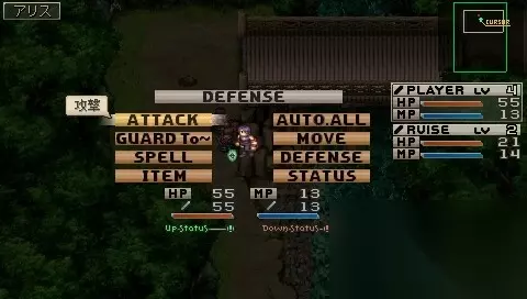 游戏的遇到方式不同于普通RPG,在地图上敌人是可见的,接近敌人随即发生战斗!不想战斗的话,绕开敌人即可!进入战斗,玩家需要对角色发出指令,角色完成该指令后,HP、MP下方的等待槽会上涨(根据角色执行的指令不同,等待槽的上涨情况也不同),当等待槽减为0时角色才能执行下一条指令!当角色处于等待状态时,玩家随时可以按下三角键打开菜单,变更指令!ATTACK(攻击):即使用当前装备的武器攻击敌人,不同武器的攻击范围不同!每人都能装备2种武器! GUARD To~(护卫):即保护某一角色!使用该指令后,角色会围绕在保护对象周围,防止敌人靠近! SPELL(魔法):使用角色学会的魔法! ITEM(道具):可以使用道具,变更装备!另外,变更装备是需要时间的! AUTO/AUTO ALL(自动/全自动):前一指令只有同伴才有,使用后同伴自动按设定好的作战策略行动;后一指令为主人公专有,使用后所有同伴自动行动!要中止同伴的自动行动需要按三角打开菜单变更! MOVE(移动):可以命令角色移动到战场的任意地方!用于变更占位、拦截敌人等!当主人公移动到战场边缘即可逃离战斗! DEFENSE(防御):防御敌人的攻击! STATUS(ステータス):查看角色当前状态!