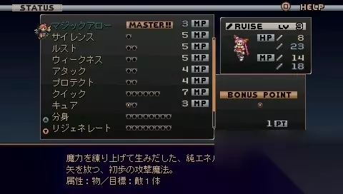 当角色升级时,可以很直观的看出角色的成长状态!同时还能获得一定的BONUS POINT值,可用于习得新技能或新魔法!不同技能(魔法)需要的BP值也不同,要习得越强大的技能(魔法)就需要越多的BP值!三,战斗指令
