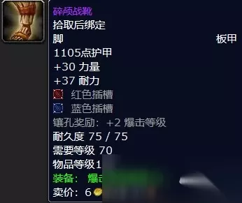 :板甲 :史诗 :拾取后绑定 :脚 1105点护甲 +30力量 +37耐力 红色插槽 蓝色插槽 镶孔奖励:+2爆击等级 耐久度:75/75 需要等级:70 物品等级:128 装备:爆击等级提高29。 :祖阿曼副本BOSS哈尔拉兹(14.3%掉落率)。