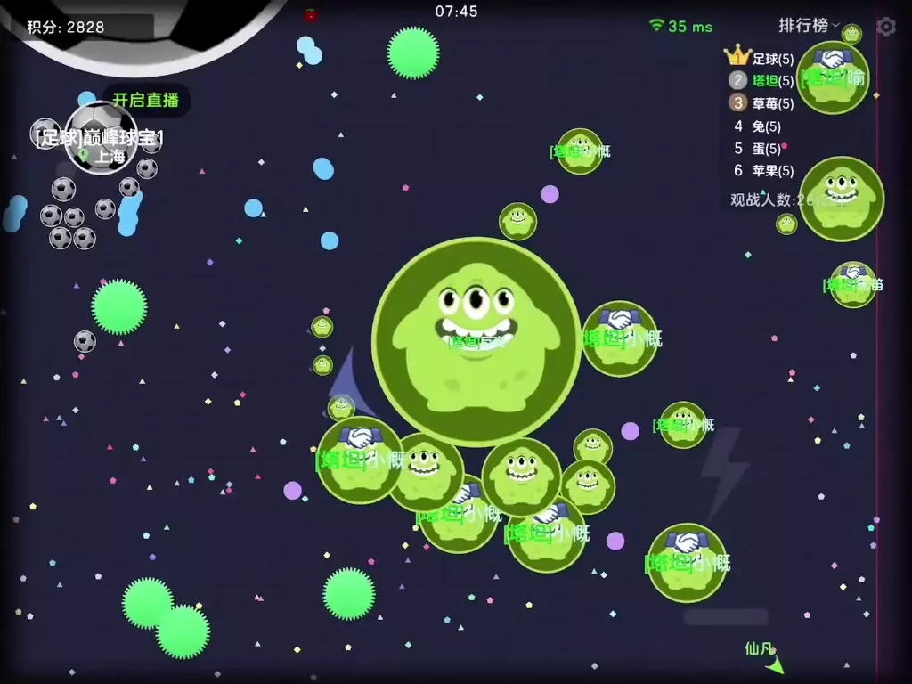 这是一则《球球大作战》的巅峰团战内容,展示了玩家在团战中运用手法和技术,通过收下大刺壮大体积,凭借勇往直前的精神作战,朝着拿下整局游戏的目标推进。