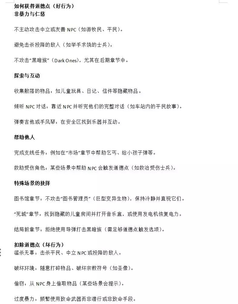 地铁2033重制版道德点位全指南 一:为什么要收集“道德点”? 1、地铁系列最特别的机制之一就是“隐藏道德系统”。 2、游戏不会告诉你做对了还是做错了,但你的每一个选择、每一段互动,都会悄悄地影响结局。 3、如果你想走出那扇“真正的大门”,道德点就是关键! 速通版(适合一周目并且想打好结局玩家看)