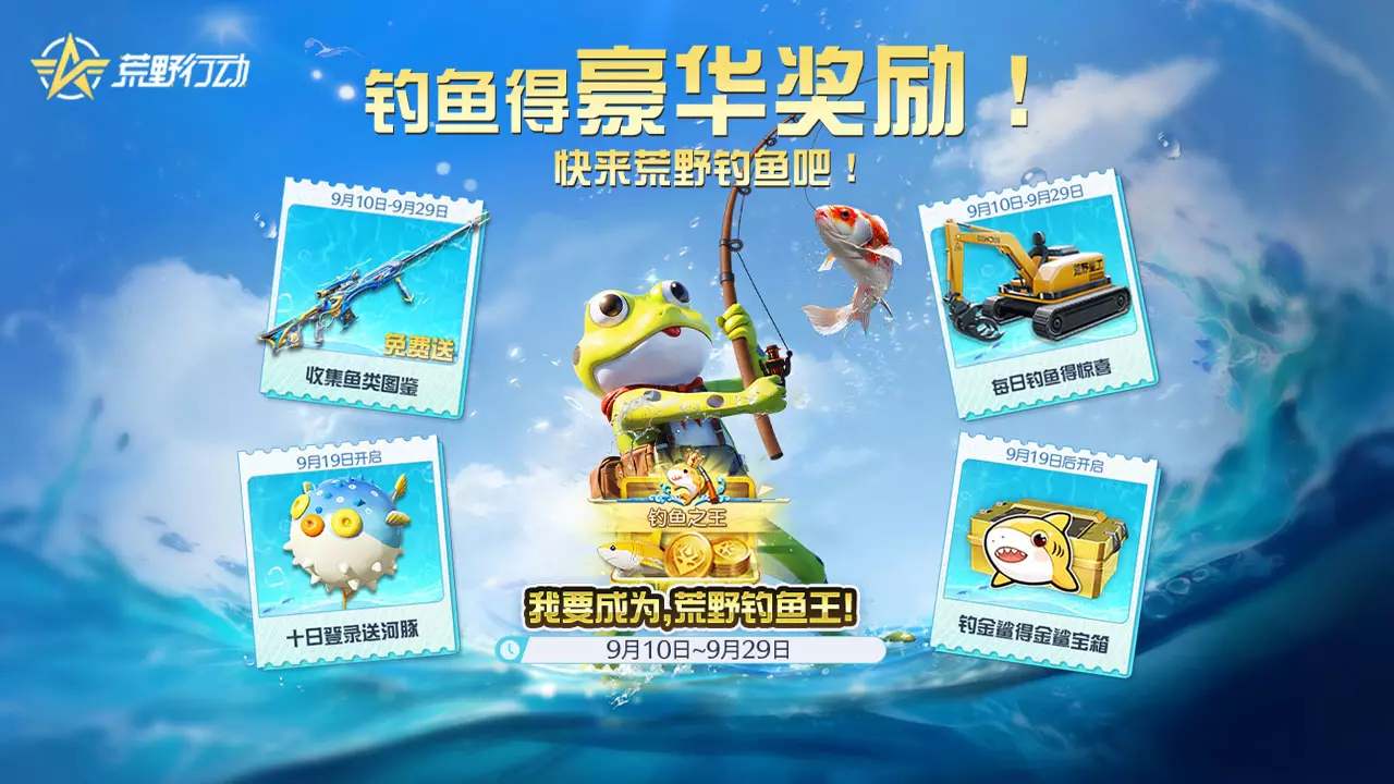 荒野行动9.10-9.29开启限时钓鱼玩法,有三大核心福利:集鱼类图鉴可领AMR-83:金鲨浪潮与10连抽;钓黄金鲨冲榜赢军需币、限定称号等;9.19起登录送降落伞:嘟嘟河豚,钓黄金鲨还能开宝箱抽道具。