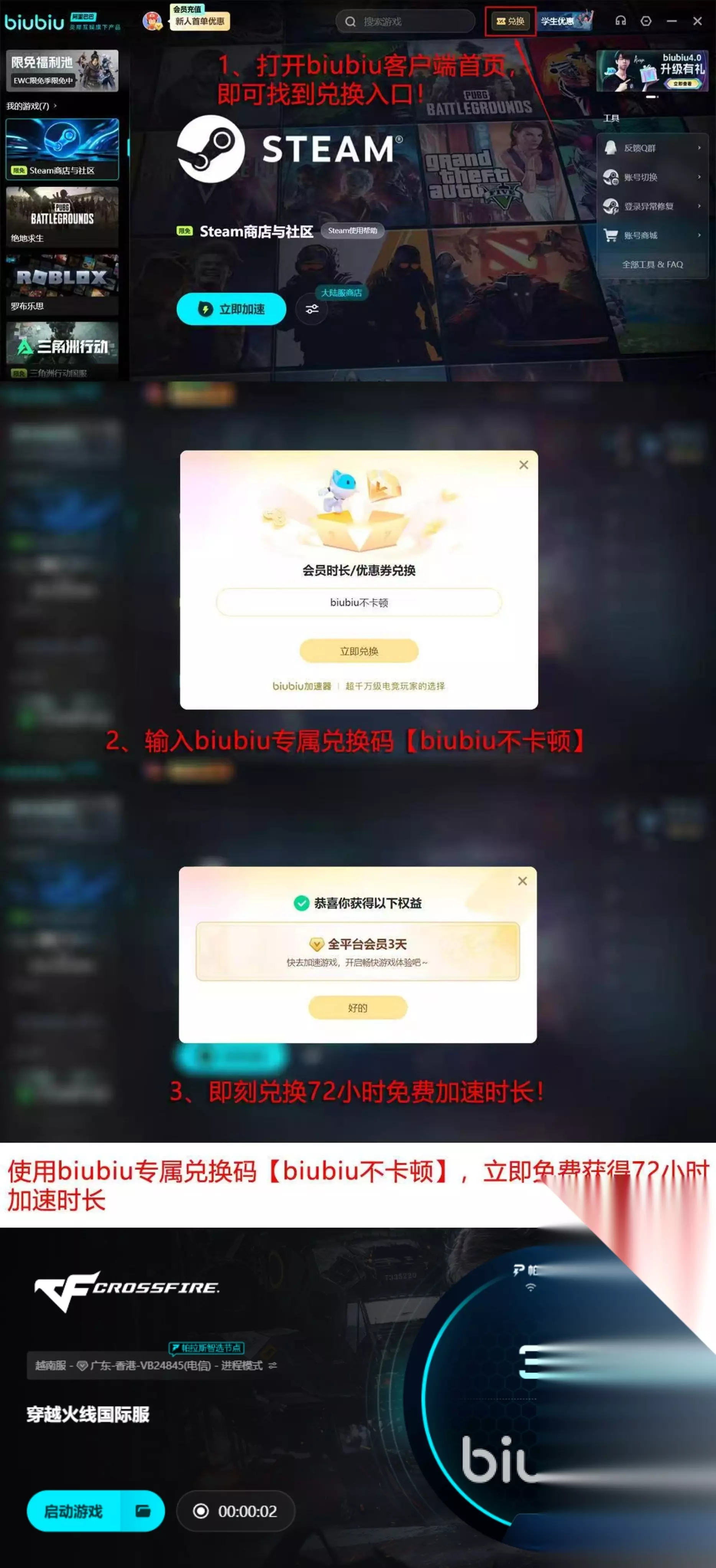 除此之外,很多玩家会担心使用门槛过高的问题,这里同样不用担心,因为biubiu加速器给玩家提供了无门槛得福利,没有听错,是零门槛,首先玩家们刚注册就能一次领取24小时的免费加速时长,所有模式都能使用,此外,小编还发现了通过输入【biubiu不卡顿】这个关键词,就能额外领取72小时的全模式加速权益,这样算算加起来有96小时免费使用呢,不需要额外花一分钱,开通后就能一键启动,立马生效,所以大家放心大胆的去冲吧。