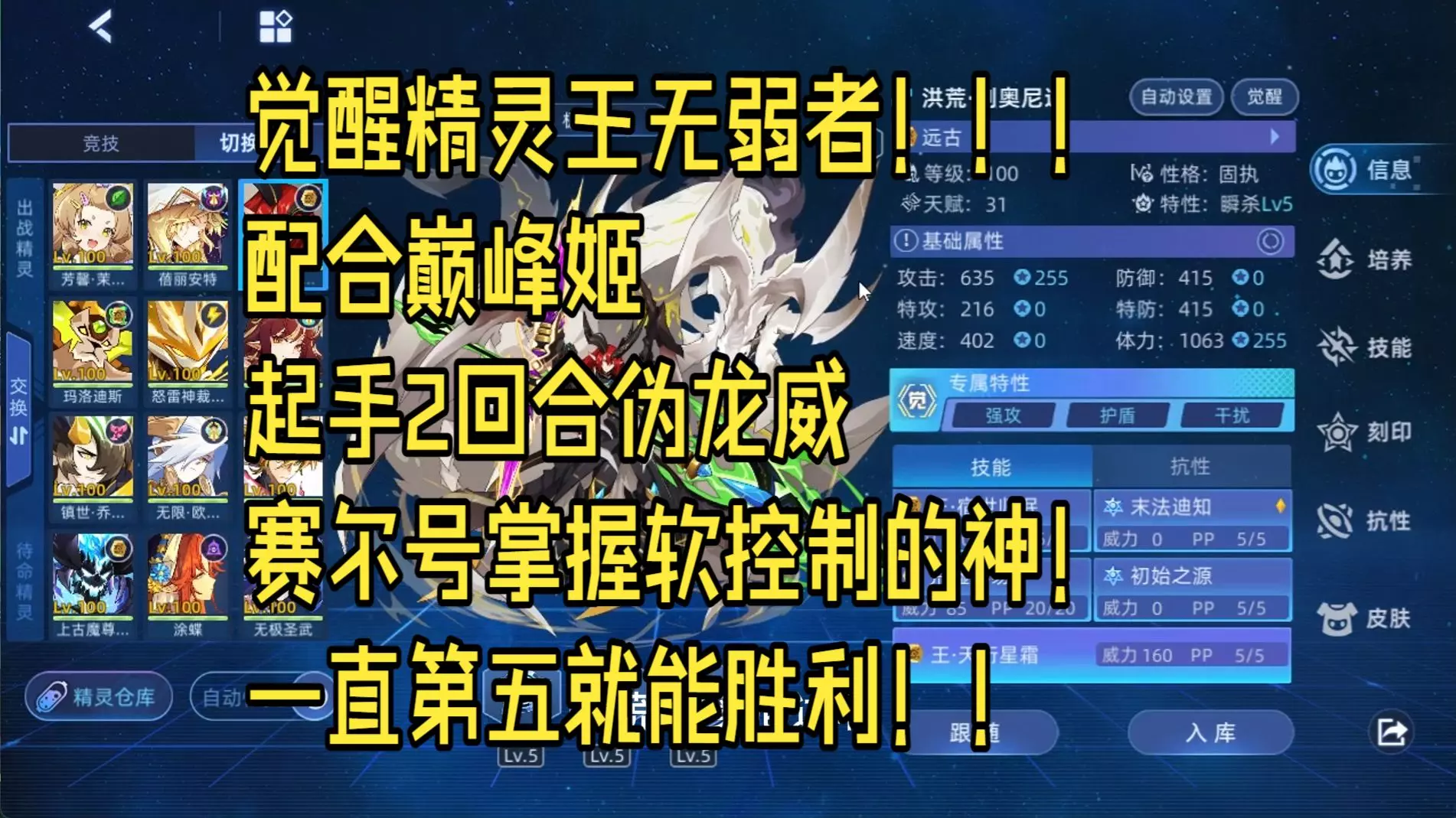 不过需要注意的就是面对星皇,星皇的穿依旧暴力,一旦星皇开门出怒或者亘古出封属就拦不住,星皇成型先三斩杀线极高,被穿死也正常。所以一旦没有优势的情况下,该中切就中切,除了星皇以外,直接能处理掉的精灵还真心不多(当然大象这个NT精灵除外)。 998先三的“摆烂之王”!