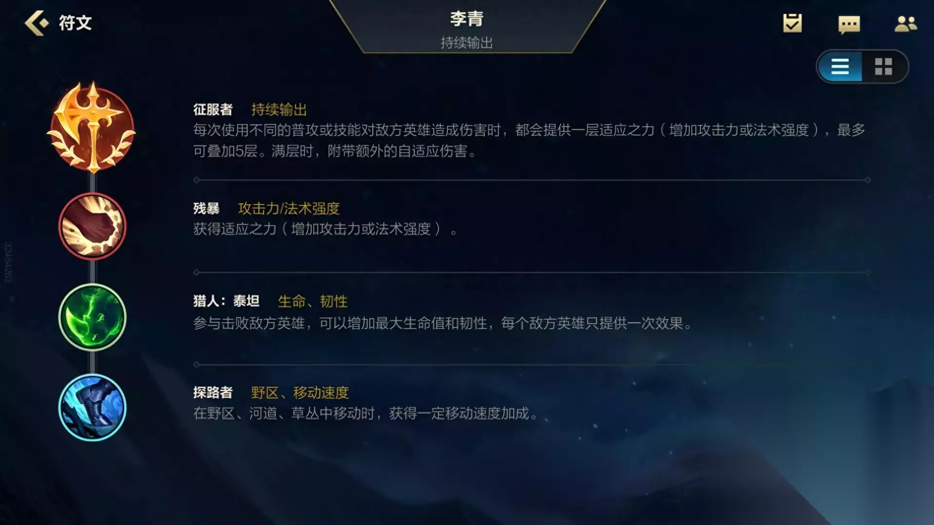 这套符文针对的是前期非常弱的英雄,比如没有到6级的剑圣,龙女,螳螂等,主要就是反野,控龙,控野区。征服者现版本战士刺客通用符文,相比电刑,相位,持久伤害足,不会出现一套差一点点伤害没有秒掉的,而且瞎子是所有英雄中叠征服者最快的,所见前期瞎子五级基本无敌。虽然残暴被削弱但是还是可以用的,可以大幅度提升前期伤害量,犀牛角(猎人:泰坦)为瞎子提供的韧性可以很好的让瞎子避免团战Q(一技能)上去踢不出大招。