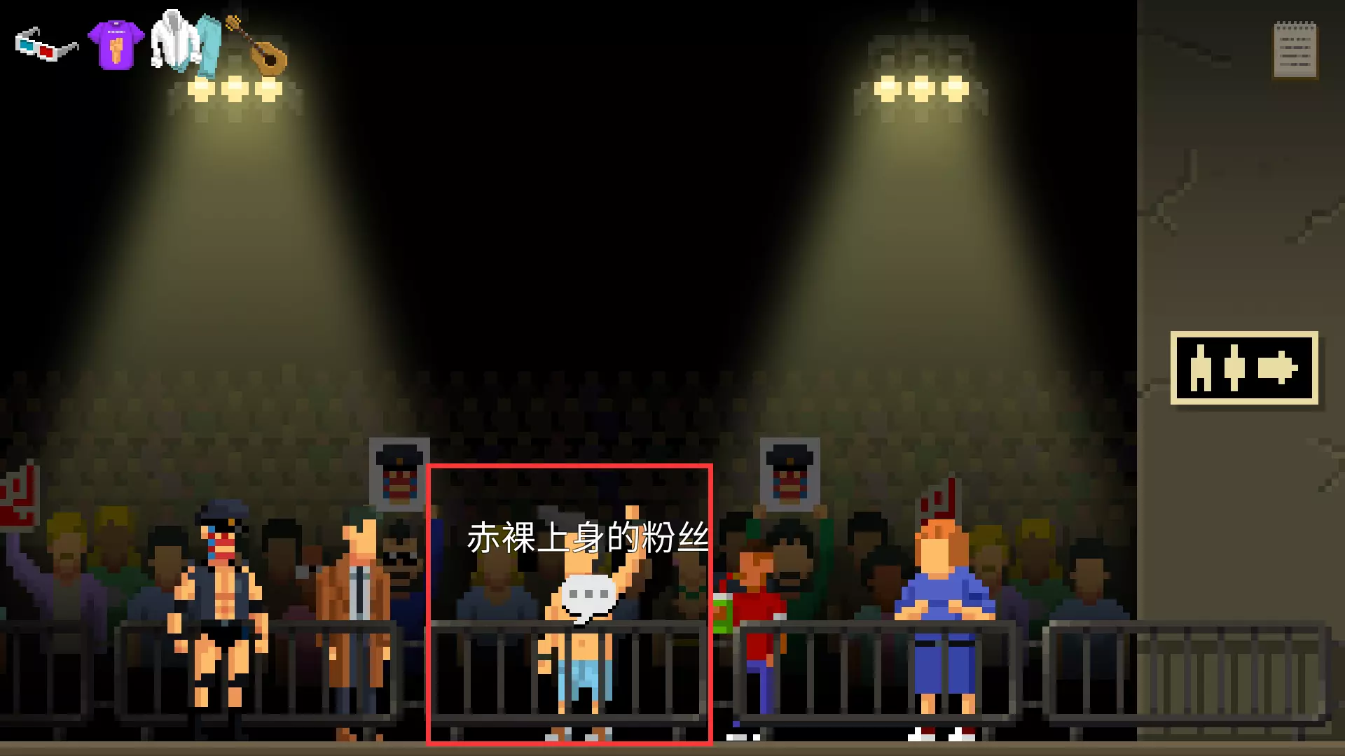 一路向右来到擂台右侧,遇到赤裸上身的粉丝,对他使用衬衫获得假发。