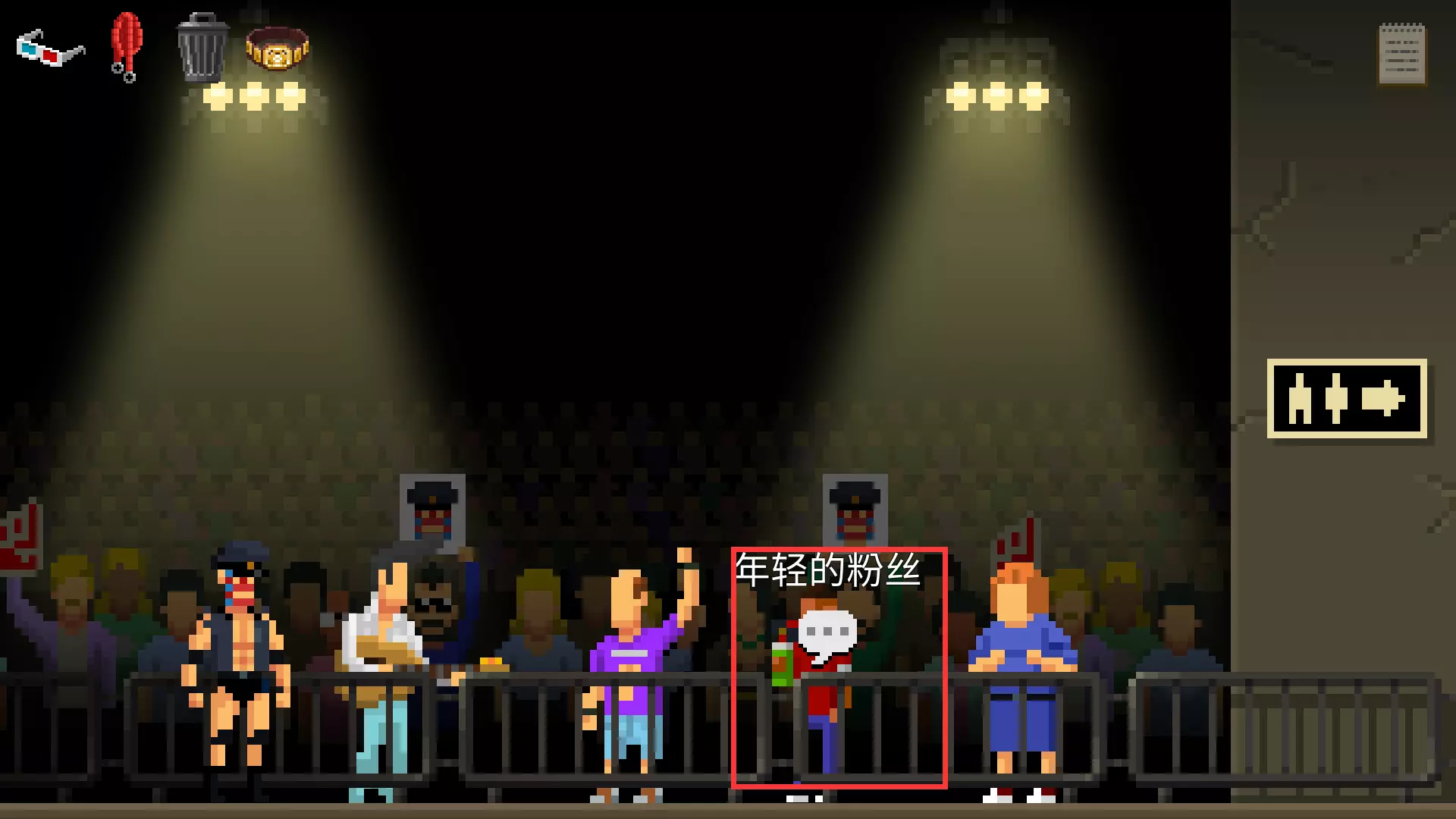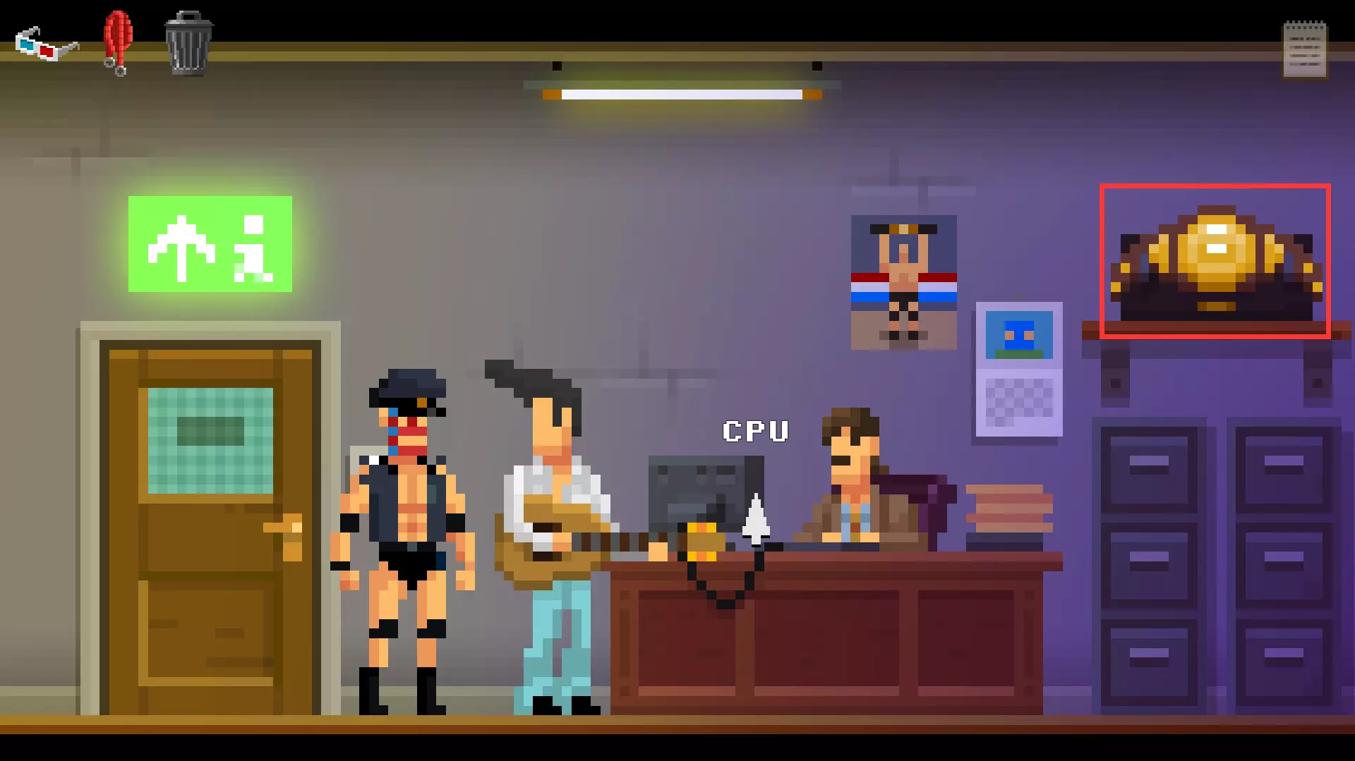 收集道具EWWW腰带。离开经理室,向右走离开建筑。进入仓库,收集道具擂台围绳,垃圾桶。