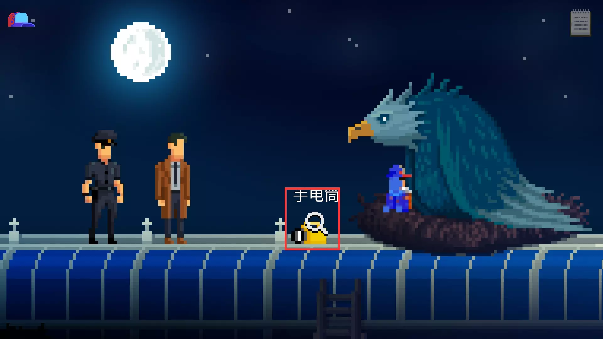 对黑暗的下水道口使用手电筒。得知雷鸟在下水道中。