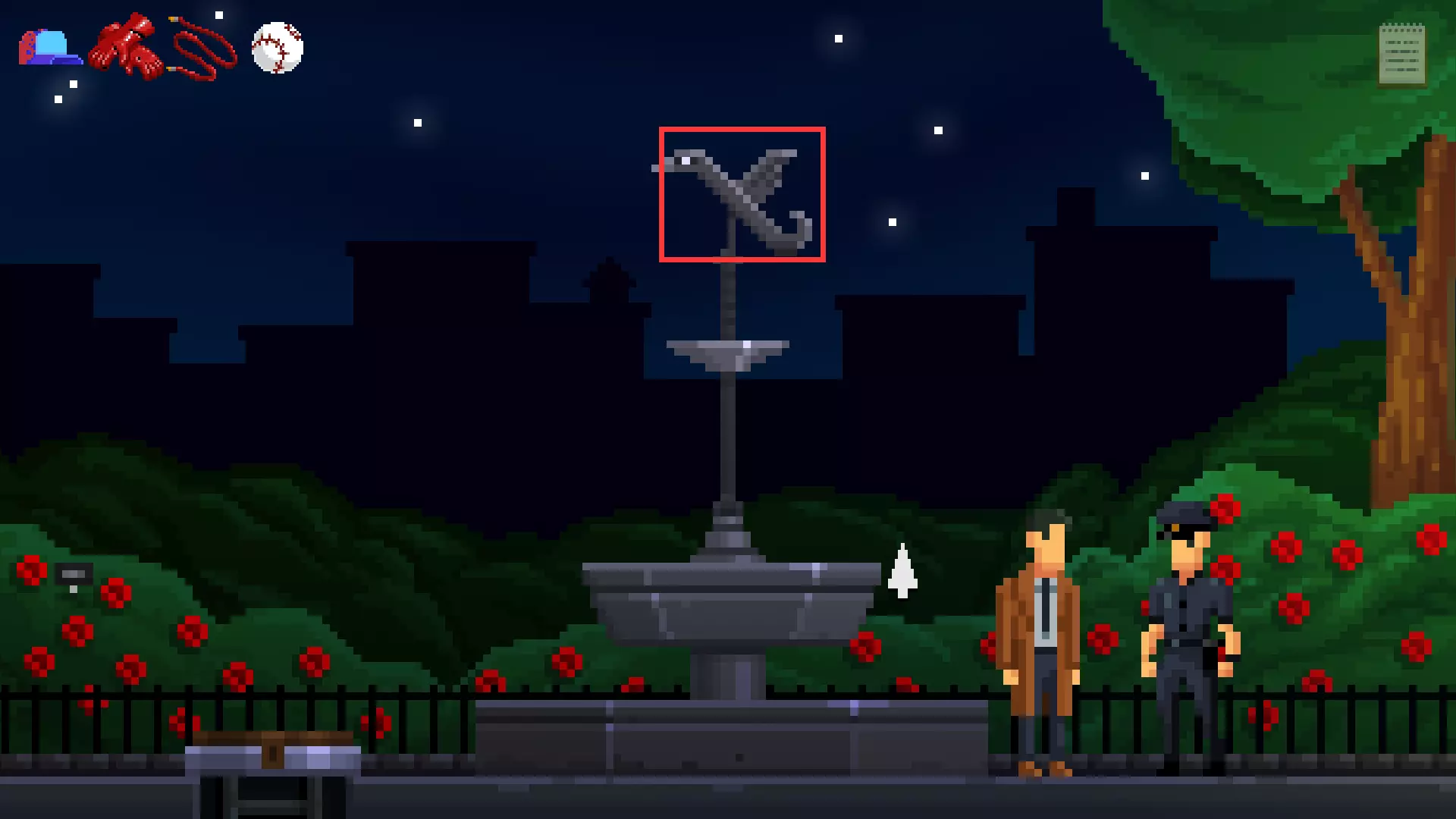 回去,向左来到玫瑰园,对风向标使用棒球,获得道具撬棍。