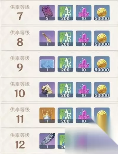如果玩家供奉圣樱树满级,可以获得: 冒险经验:200*49=9800,精华矿:10*50=500,魔拉:50000*50=250W,知识王冠:1*5=5,易碎树脂:1*5=5,遭遇命运:2* 10=20、纠缠命运:2*5=10、《浮世》哲理:2*5=10、《风崖》哲理:2*5=10、《天光》哲理:2*5=10 、北陆五原胚各一个、闪电神社钥匙:1*5=5、名片:闪电神樱、壶内装饰:《华夏织樱雨之梦》 梦想树 梦想树每级需要35个草印,总共50级,所以总共需要1750个草印,初始梦想树如下