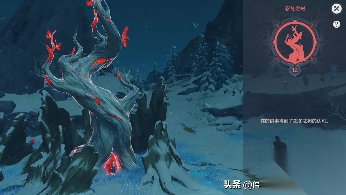 金银花树金银花树是一棵古老的巨树,守护着这片雪原。当我们探索龙脊雪山时,有时会发现一种叫做“赤玉髓”的晶体。我们可以收集赤玉髓来升级金银花树,从而提高金银花树的等级。随着升级,我们会得到邂逅之缘、纠缠之缘、风之翼、小道具图纸等各种奖励。