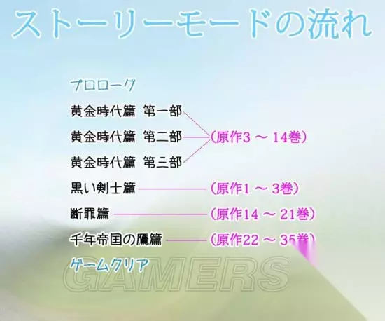 同之前提到的一样,由于《剑风传奇》是并未完结的连载漫画作品,所以游戏剧情只能玩到【千年帝国之鹰篇】最后格斯一行人出航作为结局。算下来,也是一段非常漫长的历险了。但出航前的重要剧情,如“雾之谷的妖精女王”boss未被收录。剧情模式共有47关,但其中不乏一些充数的关卡。战斗中穿插大量原著剧情对话场景,前期黄金时代篇大量套用剧场版动画作为过场,后期黑色剑士篇开始才有了实打实即时演算和CG。大部分关卡通过后,会追加一些对话(Talk)和事件(Event)作为原著剧情补完。