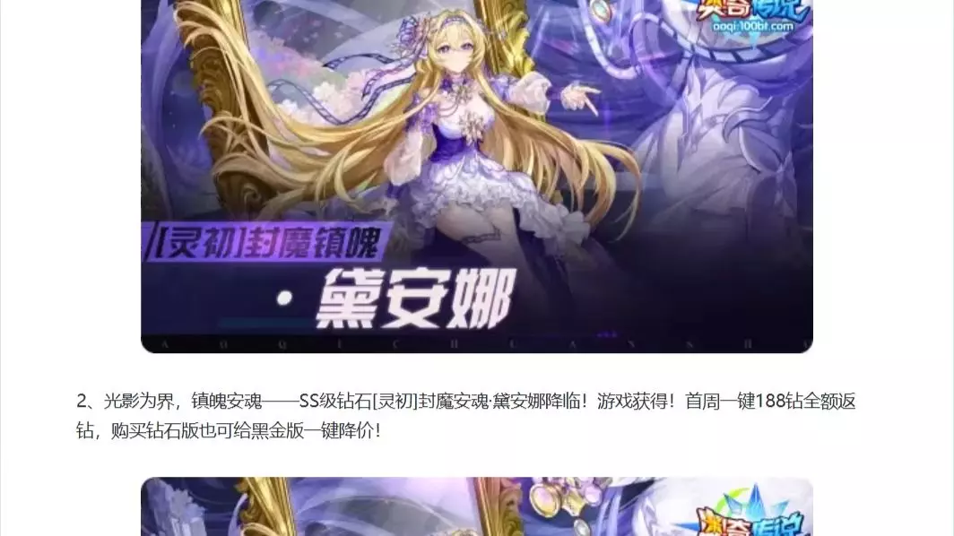 这是《奥奇传说》的游戏内容分享,介绍了灵初黛安娜、[灵初]迷心咏叹·香颂的技能机制,还带来本周福利活动:可白嫖黛安娜精华与元魂,专属精华重置,黛安娜皮肤上线,限时点券商城开启,还有黛安娜养成特惠专场。