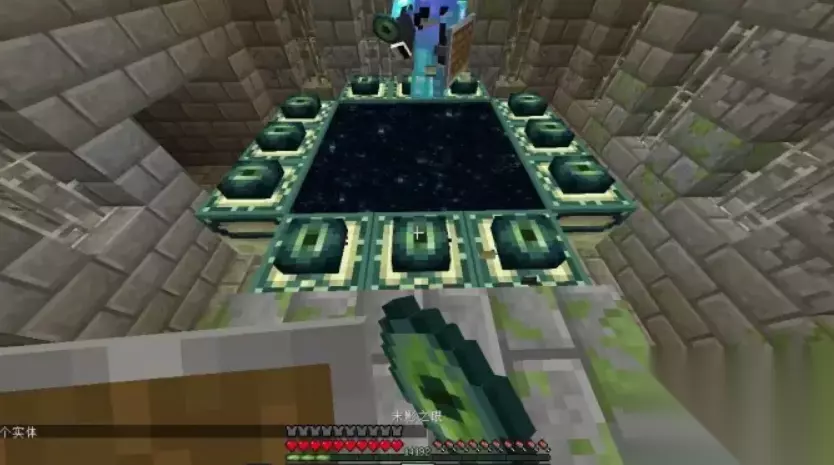 2、进入末地之后就可以看到末影龙的血条了,我们可以使用末影之眼传送到末影龙的附近。