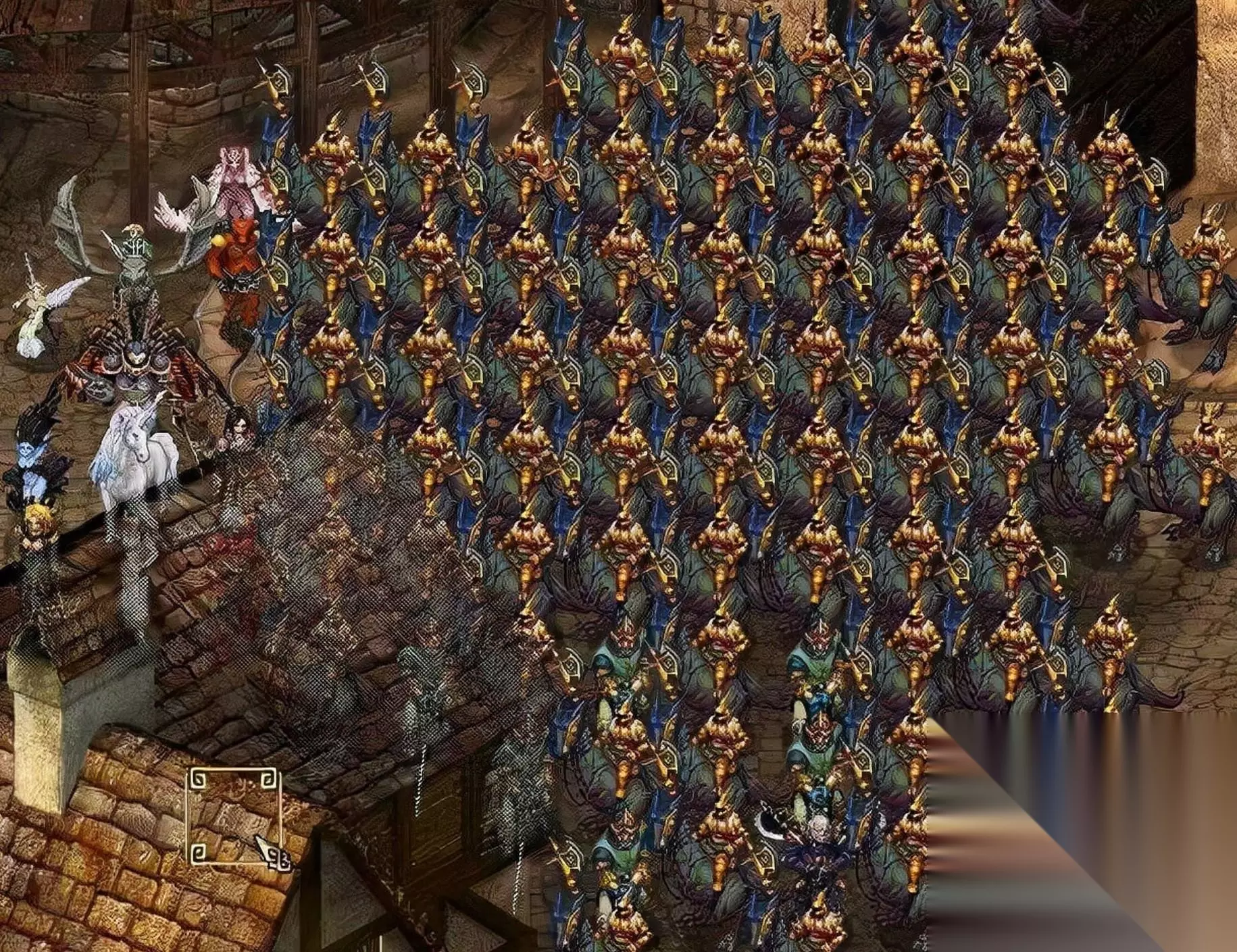 面对这从四面八方涌入的黄金龙骑兵,正常情况下我方根本没有任何胜算。不过《阿玛迪斯战记》游戏存在着一个BUG,战斗中将装备卸下再重新装上去,人物的SP值会回满。 这样一来我方可以在墙角结成队形,无限使用必杀技来消耗敌人的有生力量。 可即便如此,想要全灭敌人的难度非常之大,因为古斯塔夫攻击力超高,大招会秒人,想要赢得胜利还需要一点运气。
